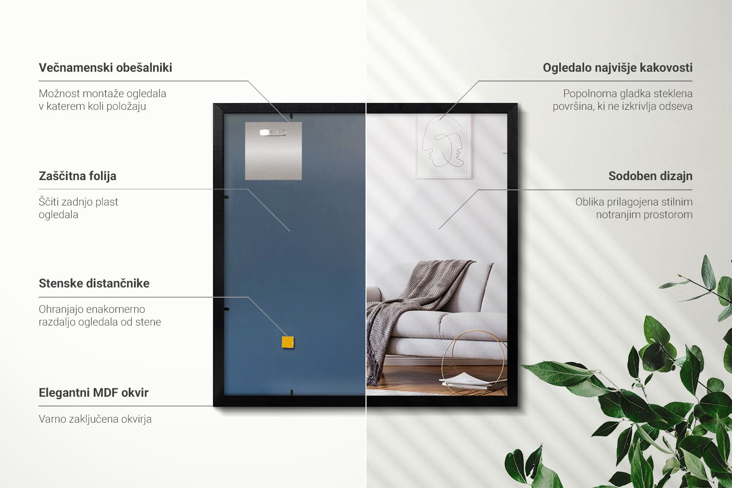 Zahvaljujoč različnim velikostim je pravokotno ogledalo s črnim okvirjem mogoče enostavno prilagoditi vsakemu interierju – od prostornih dnevnih sob do udobnih kopalnic ali hodnikov. Obešeno na steno postane tako praktičen pripomoček kot tudi učinkovita dekoracija, ki poudari slog vašega doma. Ogledalo ne odbija le svetlobe in s tem osvetli prostor, temveč dodaja tudi globino, zaradi česar je vsak prostor videti prostornejši in bolj urejen. Z izbiro pravokotnega ogledala s črnim okvirjem investirate v detajl, ki bo v vaš interier vnesel harmonijo, estetiko in brezčasen slog.